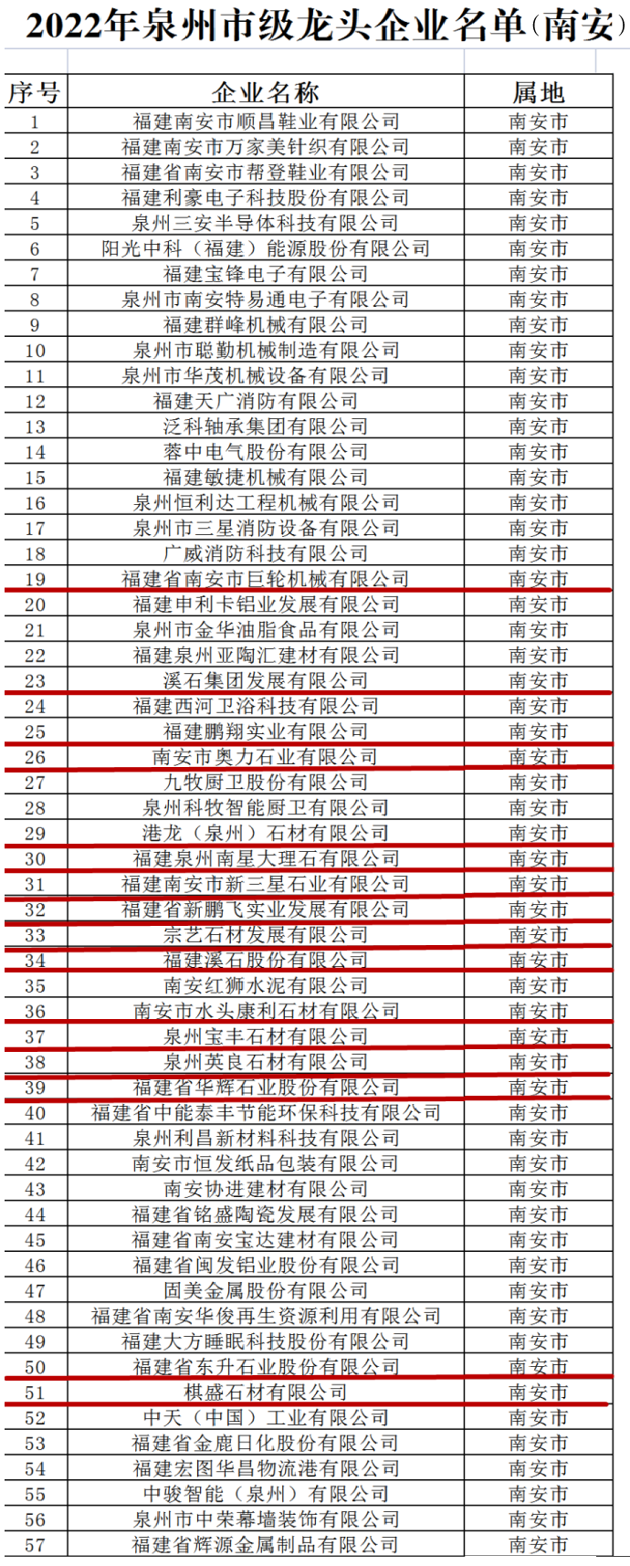 前几日,杏耀开户测速泉州市工业和信息化局公布了“2022年市级产业龙头企业名单”,共有351家企业入选,南安市共有57家企业入选。本次入选企业涵盖建材家居、机械装备、纺织鞋服、电子信息、石油化工等多个领域,其中16家石材机械相关企业入选。