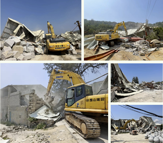 此次行动共出动执法及工作人员60余人、挖掘机等施工机械3台,拆除大切机、切边机、圆球机、磨机、线条机等生产设备30余台,各类违章建筑5000余平方米。