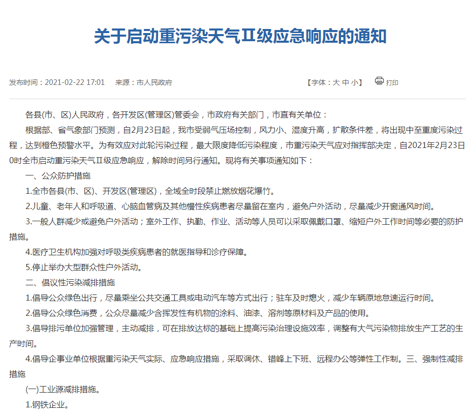 唐山市人民政府发布《关于启动重污染天气Ⅱ级应急响应的通知》自2021年2月23日0时全市启动重污染天气Ⅱ级应急响应,解除时间另行通知。