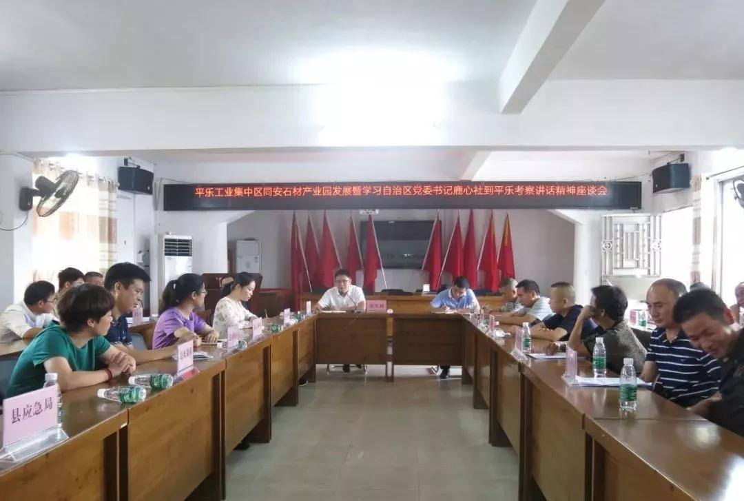 平乐石材协会在同安镇政府二楼会议室召开平乐县工业集中区同安石材产业园发展暨学习自治区党委书记鹿心社到平乐考察讲话精神座谈会,19家企业代表和县、镇相关单位参加座谈。