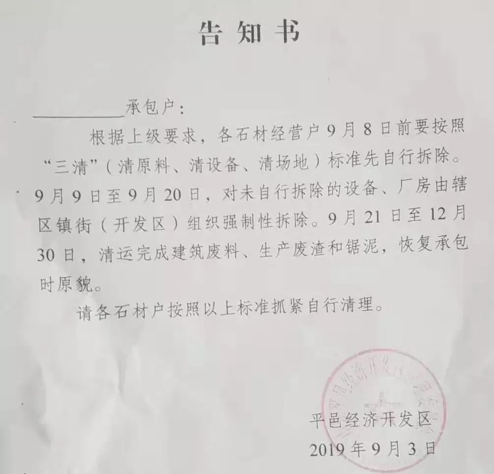 三、对石材规划外小散乱污石材企业下达告知书,并明确要求9月3日前按照“三清”(清原料、清设备、清场地)标准先自行拆除,9月4日至9月15日对未自行拆除的设备、厂房由街道组织强制性拆除,9月16日至12月30日清运完成建筑废料、生产废渣据泥,恢复土地原貌。2020年1月1日至1月10日由街道组织自查,1月11日至20日县石材产业提升指挥部组织验收。