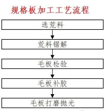 选荒料→荒料锯解→毛板检验→毛板补胶→毛板打磨抛光→大板检验→大板选料→切规格板→规格板检验→排板、编号→开槽、磨边等二次加工→二次加工检验→排板、防护→成吕交货→成品检验→包装→发货