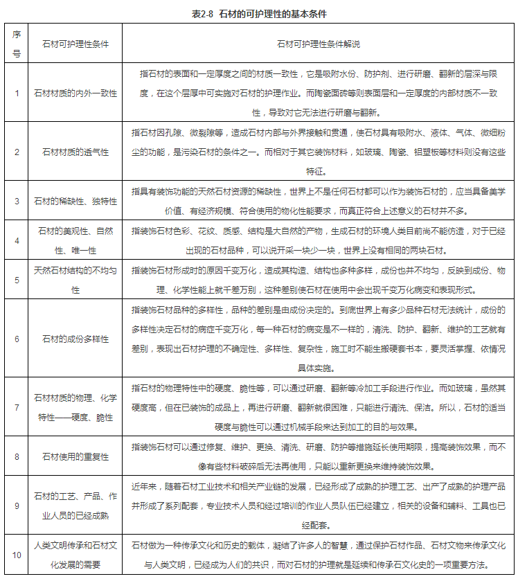 石材的可护理性的基本条件见表2-8。
