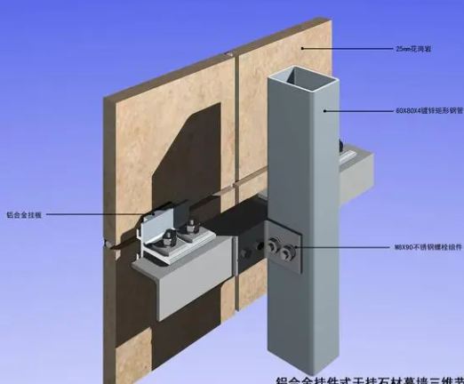 计算时通常考虑材料的自重、所受风荷载及地震荷载,并根据荷载作用方式对其进行组合。其相应分项系数及组合系数都应严格按规范要求取用,对某些特殊的建筑物,设计说明书中对相应荷载计算取值会有特殊要求,在计算时应和规范对照取其最大值。对干挂体系进行计算时,应根据刚体的力的传递的特性,确定其所受荷载进行力学计算。有时。一些荷载不易确定时,可通过模拟试验来确定其大小。