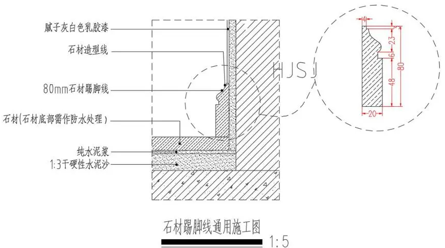 3、找平层砂浆干硬后,拉踢脚板上口的水平线,把浸水阴干的大理石(或花岗岩)踢脚板的背面,刮抹一层2~3mm厚的素水泥浆(宜加10%左右的107胶)后,往底灰上粘贴,并用木锤敲实,根据水平线找直。