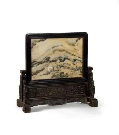 座屏,与插屏相仿,所不同的是体量要大得多,常常落地放置在室内,最为典型的例子是留园五峰仙馆内西北隅的大理石座屏,属留园三宝之一。这是一款非常罕见的大型大理石,极其珍贵,石呈圆形,直径达1.4米,产自云南点苍山,石面展示的是一幅天然的山水画,青山连绵,飞瀑急下,树木苍翠欲滴,更为难能可贵的是,一侧还有一轮氤氲隐月,整幅画面阐释着“风前闲看月,雨后静观山”的宁谧意境。由于此石巨大,分量不轻,因此底座也是用粗大的木料做成,落地端放,与名闻江南的楠木大厅相映成辉,许多游人在此驻足,与“画”合影。