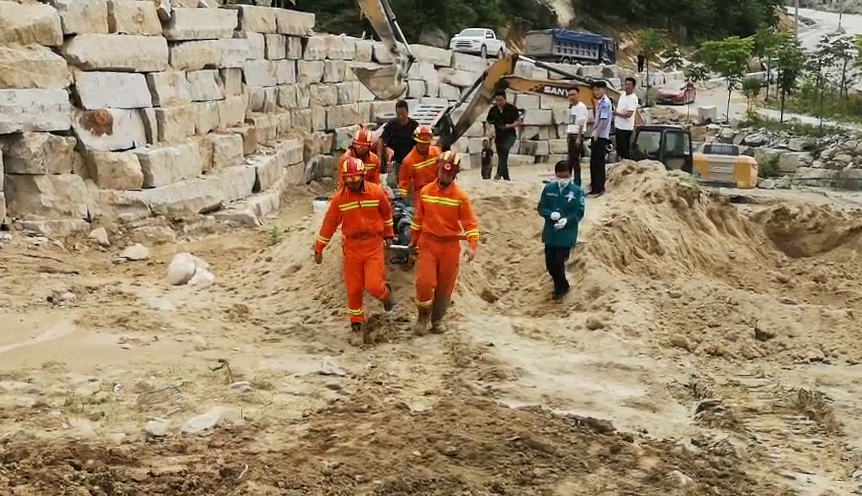 为便于营救,确保被困人员和救援人员的安全,现场指挥员联系采石场内的两台挖车对事故车辆给予支撑和固定。