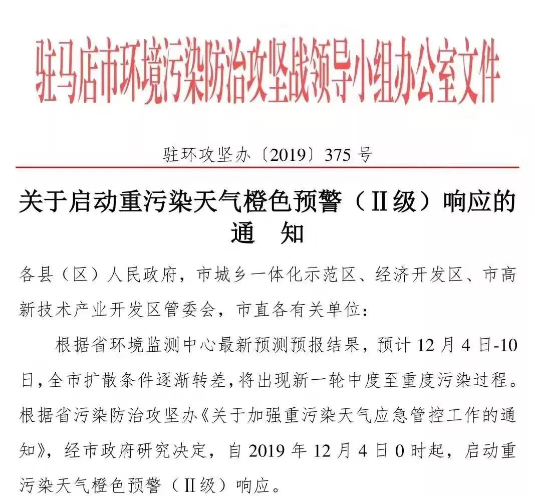 【紧急通知】各企业:我市于12月4日00点已经启动重污染天气二级应急管控,