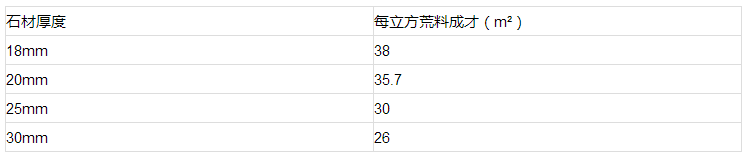 1. 石材荒料要经过切割,加工成可以利用的形状及厚度,按18mm,锯材缝8mm,则每立方米荒料可以出材1000÷(18+8)=38.46平米。