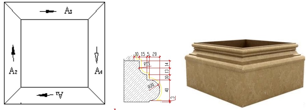 5. 三维异型角:这是石材加工中较为麻烦的切角方式,是切端面角的一种特殊形式。从图5中可以明白,所谓的三维角就是线条底面与工作台成一定角度后再对线条切端面角的一种特例。从图5右的装饰图中可以看出来这种线条安装后并不是与装饰面在一个立面上,而是在另一个装饰面上,即所谓的在三维空间上。