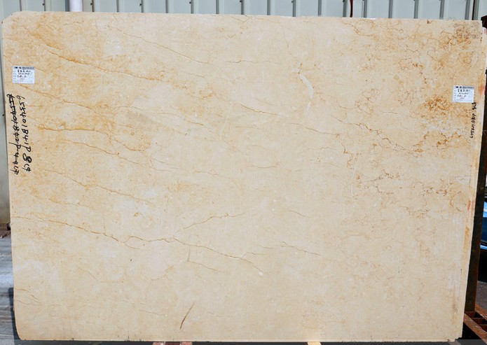 版面特性:皇家金大理石分为直纹及乱纹, 直纹料是有水平方向的纹路。荒料高度较低,大约有1米到1米2高,有点像木纹石的感觉。 乱纹的荒料则没有明显的纹路,底色较均匀,但较则较易出现裂。
