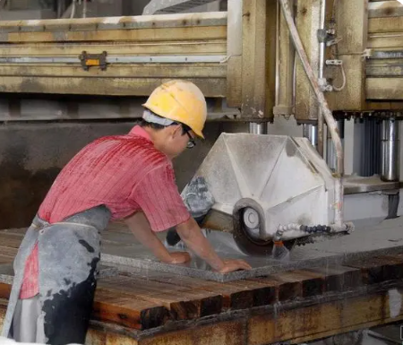 砂锯,圆盘锯车间会根据荒料课的初步报告挑选适合具体项目的荒料编号,然后按照编号领取荒料出库,安排荒料切割。同一颗荒料切完之后按照“荒料编号+大板编号”的格式给每一片大板编号。经检品员二次检验后,做出大板入库清单。这样的编号检验方式,可以保证同一区域里面的石材采用同一区域甚至同一颗荒料,今后同一项目需要补充供货的时候也可以根据大板编号找到颜色石质最相近的大板;