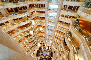 图1是笔者当年所接触的土库曼斯坦总统酒店的回廊处的由板材与弧板组合加工的产品,具体数量不清楚了,记得每层楼处都有这种产品,大楼有几十层之高,见图3每层楼层之间的护栏部分。看到这种设计的截面图时笔者向工程技术部提出了修改方案,按图2方案加工。工程技术部人员经与该工程的客户沟通,客户同意了按图2设计方案生产加工。别小看这个设计方案的小小改动,一个极其简单、容易的改动,仅仅将面板向外挪了3mm,但这种大多数人想都不会想,瞧都不瞧一眼的改动,所产生的收益却是巨大的。