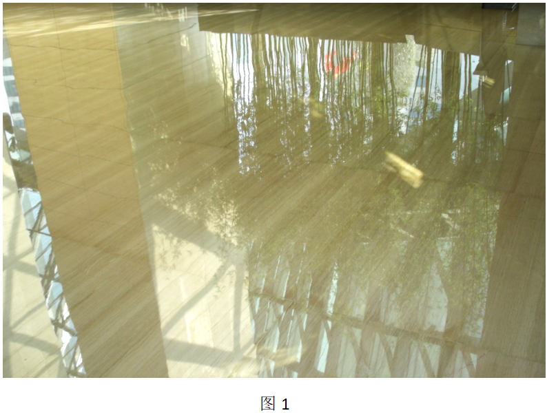 图1为拍摄于深圳京基100大厦大堂的意大利木纹石材地面,亮晶晶的地面有如冰的晶莹,看了如此光滑的地面有种令人摔倒恐惧的感觉。进出人流众多的写字楼的地面有必要做到如此亮晶晶吗?每天匆匆忙忙忙碌的人谁有心思欣赏它的光彩照人呢?又有几人懂得这种光彩照人的地面所创造的环境艺术之美呢?