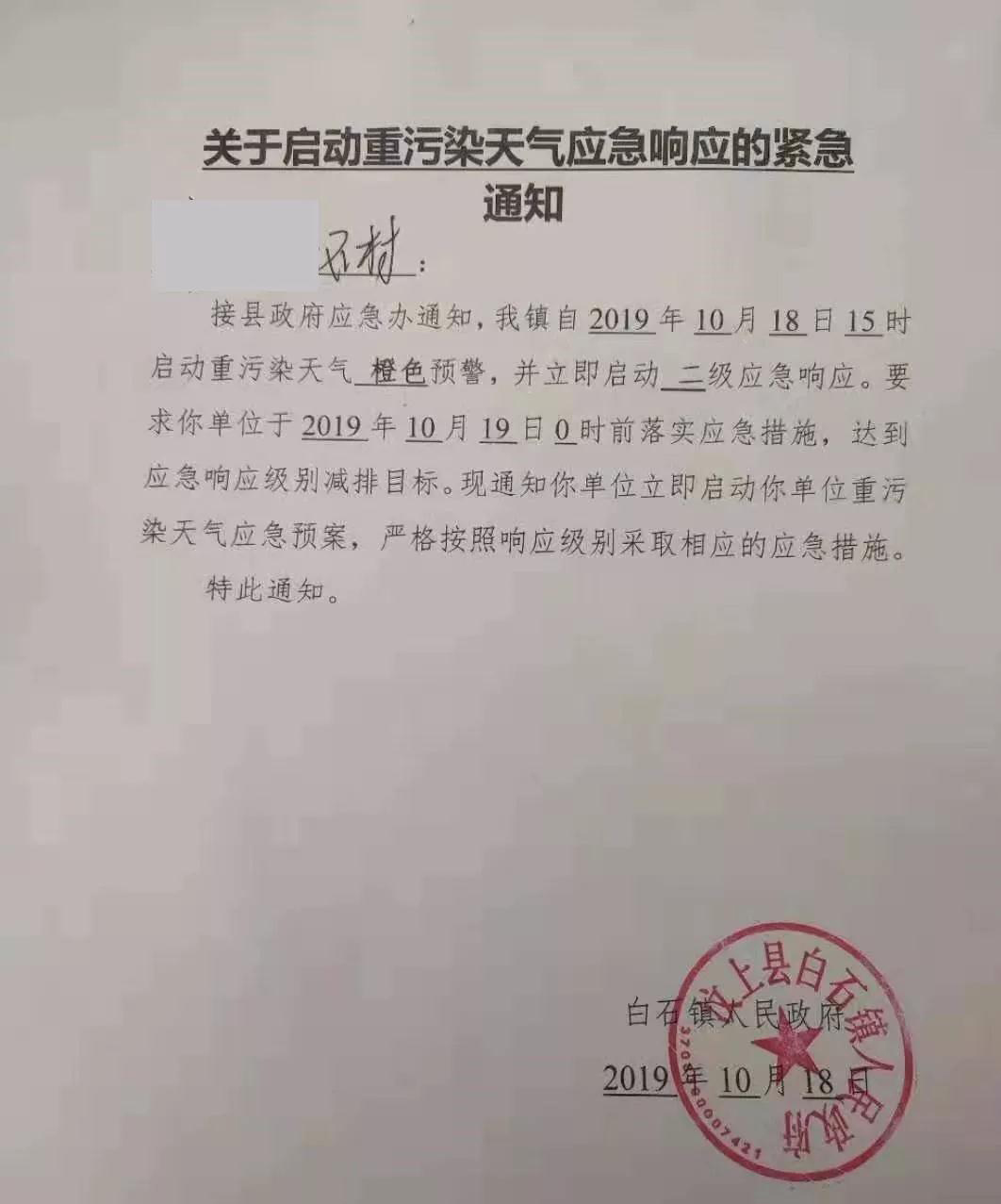 并立即启动二级应急响应。要求你单位于2019年10月19日0时前落实应急措施,达到响应级别减排目标。