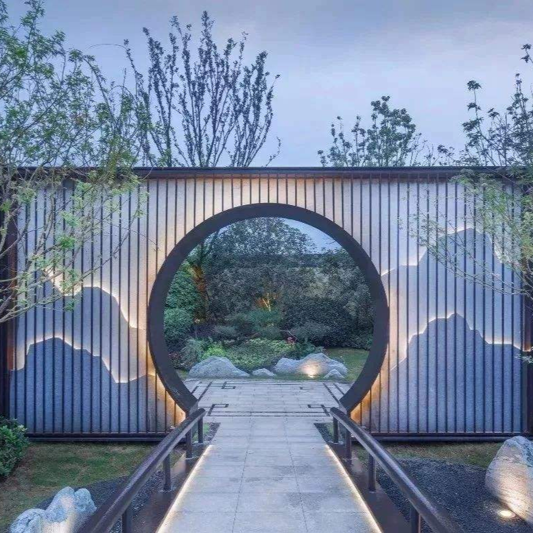 扇形(圆形)图案内,内外材料和规格尽量统一,不建议采用方形石材铺砌。