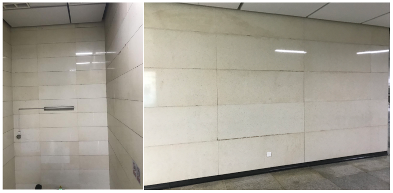 图1~10为深圳地铁1#、2#线使用的人造石,反映了人造石产品2个最主要的问题—变色、变形,尤为严重的是变色。原本是浅米黄色的人造石使用了一段时间颜色变得相差很大,颜色深了许多。图1可以清晰地看出色差,由于颜色差异大了,原来同一面墙要求颜色一致的产品成为了马赛克产品了。图1~图10的人造石产品大量存在于深圳地铁1#~2#线,看了真是让人无地自容。如此糟糕的人造石产品怎么让它流入市场呢,而且堂而皇之地挂在人流量非常大的地铁站内?这究竟打了谁的脸?作为老石材人,我看了真是脸上发热,羞愧!