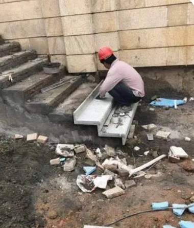 石材施工前将地面基层上的落地灰、浮灰等杂物细致的清理干净,并用钢丝刷或钢扁铲清理,