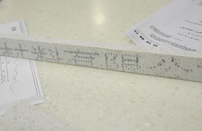 6、优质的石英石硬度硬,刮后不会有粉末,并且还会有刀的金属颜色留在石英石上。
