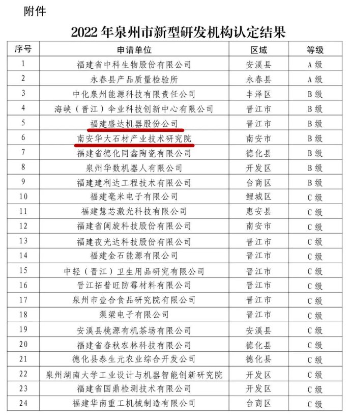 近日,杏耀平台待遇泉州市科技局发布《2022年度泉州市级新型研发机构拟认定结果公示》,经申报、受理、专家评审、现场考察、部门研究等环节,福建盛达机器股份公司、南安华大石材产业技术研究院被认定为泉州市新型研发机构(B级)。