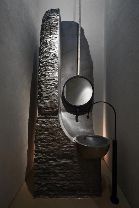 石材与织物的组合并不常见,但当这种叫Khadi的印度轻纱遇到大理石,纱线规则有序、井井有条;大理石自由不羁。纹理之间交织重叠,在墙上表现出运动和多维效应的光线阴影。