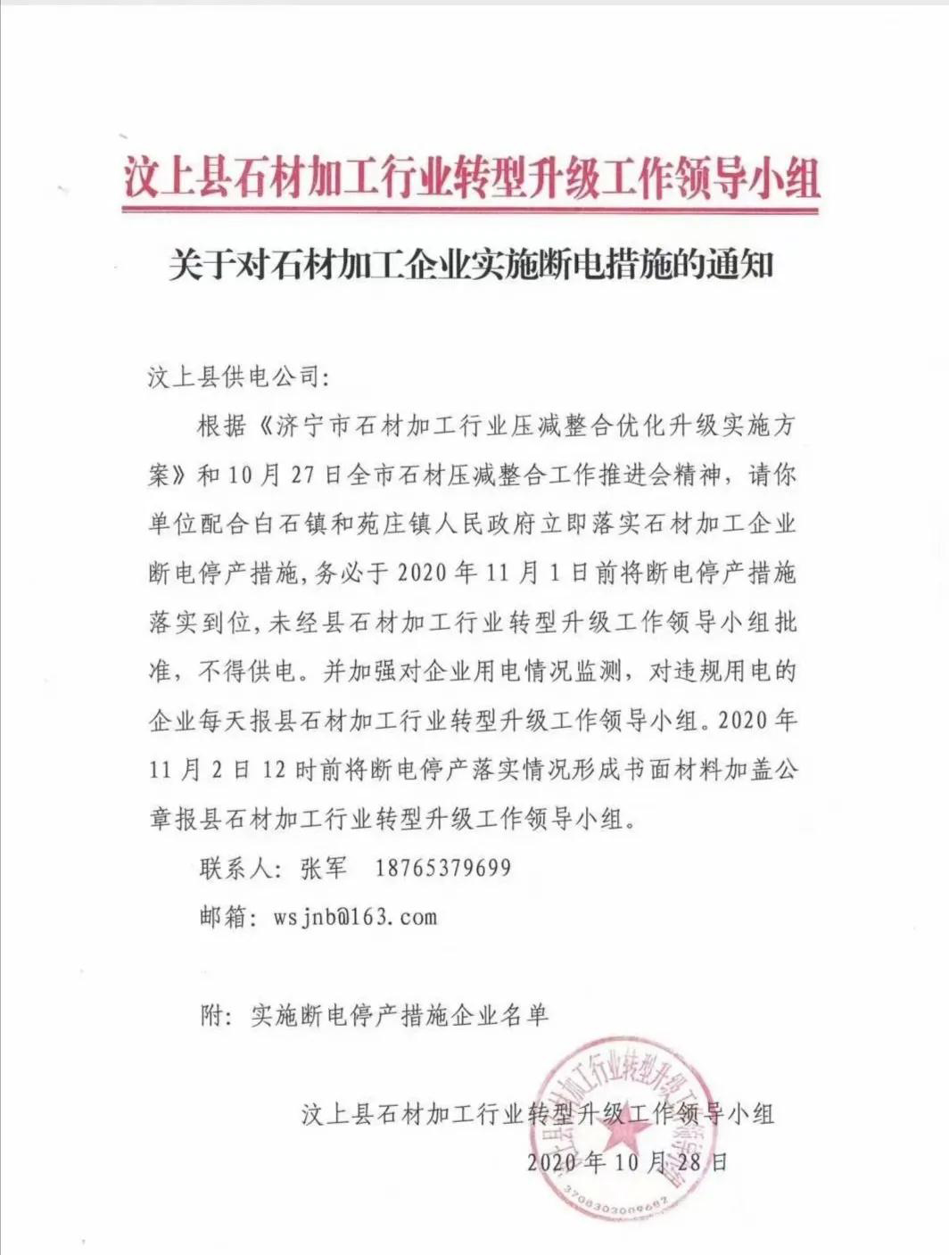 根据《济宁市石材加工行业压减整合优化升级实施方案》和10月27日全市石材压减整合工作推进会精神,请你单位配合白石镇和苑庄镇人民政府立即落实石材加工企业断电停产措施,务必于 杏耀登录2020年11月1日前将断电停产措施落实到位,未经县石材加工行业转型升级工作领导小组批准,不得供电。