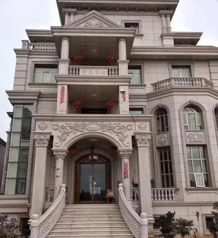 那么问题来了,为什么福建人连村里的房子都修得这么好,雕梁画栋,气派十足?仔细看,这些房子全都采用了天然石材作为主要装饰材料,从外墙干挂、地铺,到门廊罗马柱、穹顶、石线、石雕,最后到室内的背景墙、墙壁浮雕,无一不采用天然石材。将石材的可塑性、艺术性发挥得淋漓尽致。