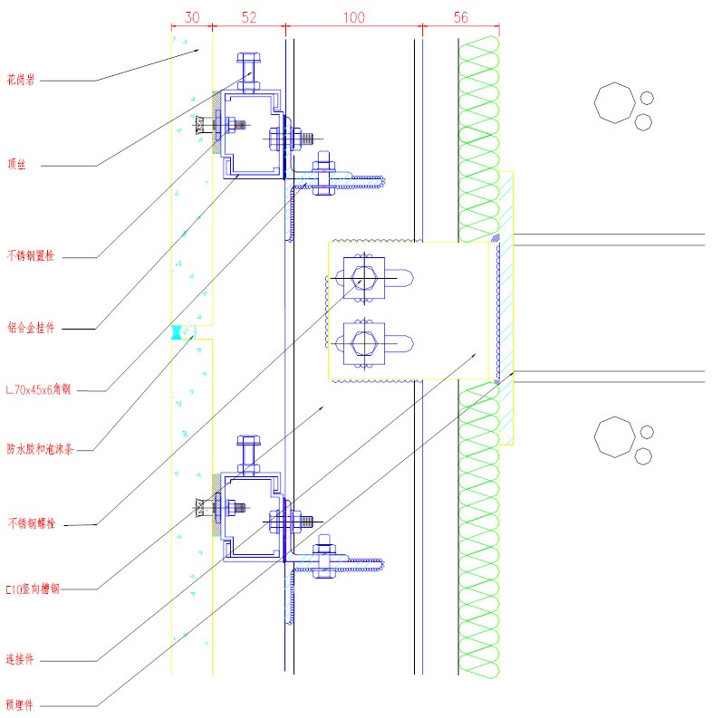 3、石材背面采用不锈钢胀栓连接,连接强度高,节省强度值约30%左右。