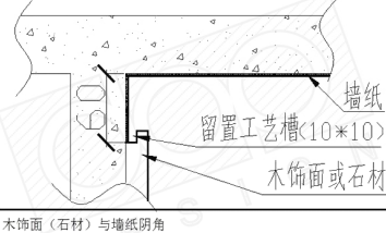 墙纸与木饰面、石材在阴角交接处交接除常见的将墙纸边沿直接靠紧木饰面、石材平面外,另推荐以下两种收口方式共参考。