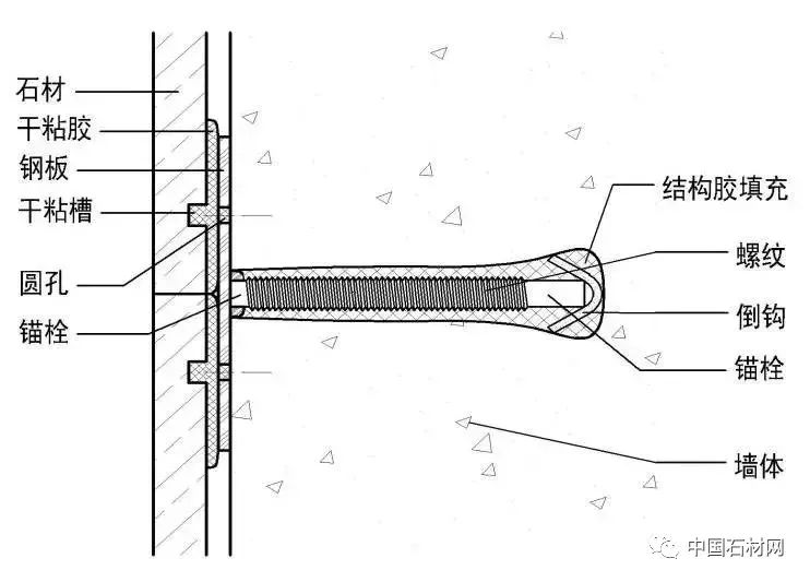 1)先将基层处理平整,在4块石材的分缝交点位置,打一个圆孔,再将结构胶填入圆孔内。