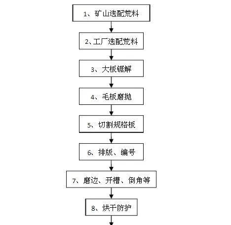 ②荒料进厂后,依工程图纸细致选配荒料,通过目测,水浇,打磨荒料样板对比,