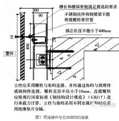 石材幕墙抗震构件不能承受过大的位移,例如当层高为3m,Δυ为1/60时,层间最大位移可达35mm,幕墙构件必定会破坏。若在幕墙与主体结构之间,采用弹性活动连接的抗震构造,力求做到幕墙框架受力变形过程与混凝土框架受力、变形相一致,就可避免幕墙构件的破坏。