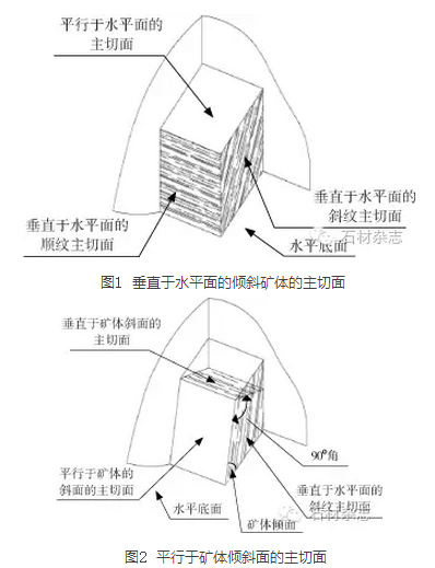 如果倾斜矿体岩层整体性好,平行于倾斜面的裂隙不发育,或者这些裂隙间距比较大时,无论主切面方向如何,所采石材的强度都不会受到影响,只要使主切面上的花色最漂亮或能够满足市场上的需求,将主切面选定在垂直于水平面,或者沿矿体的倾斜面的面上都可以。