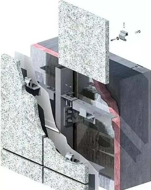 石材幕墙一般采取干挂的安装方式,因为干挂相对于湿贴造价稍高,但是有一些好处。干挂安全可靠度较高,不容易坠落,所以较高的墙面都用干挂。外墙湿贴容易出现泛碱现象,影响幕墙观感。湿贴的抗冻融性能也差一些,在冰冻地区容易出问题。