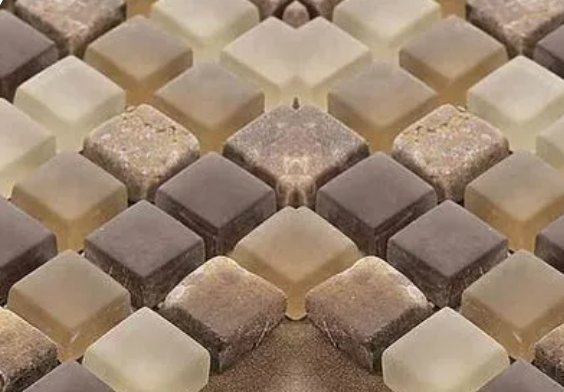 抛光表面的马赛克拼花块可以直接从光板的边脚料中切割获取。而亚光或毛面的拼花块则需要进行毛面处理。首先将1-2cm厚、不同颜色的废弃板材边角切割成正方形、矩形、三角形、菱形、或其他可作为拼花的基本形状的规则拼花块,放入滚筒中。当滚筒旋转时,板材之间相互摩擦,最终形成形状规则、边角圆滑、表面亚光、磨损程度一致的毛面拼花块。