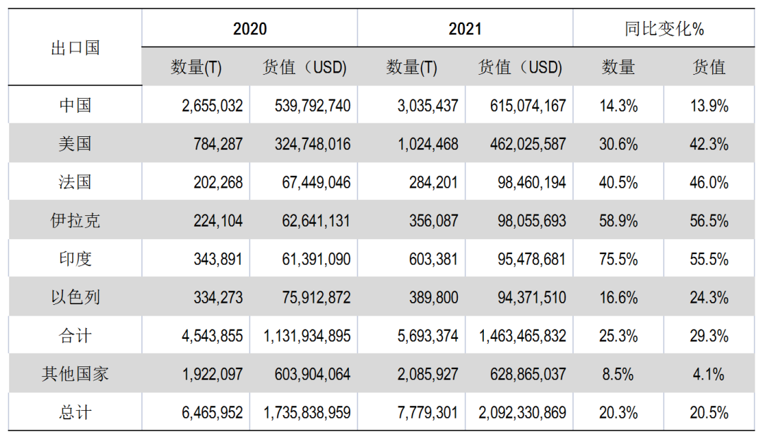 2021年,土耳其石材出口增长的主要原因是高附价值产品份额的增长。美国、法国、伊拉克和以色列是其出口主要市场,2021年,土耳其对美法等四国的出口额同比分别增长了42.27%,45.98%,56.54%和24.32%。中国和印度是土耳其荒料出口的主要市场,2021年,土耳其对中、印石材出口额同比分别增长了13.95%和55.53%。荒料约占土耳其石材出口量的46%,